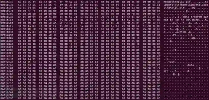 让我想想,如果.pif文件被嵌入在文档中,那么我们该如何提取它呢?又怎样才能找到这个文件的位置呢?这让我想到了名为hexedit和 CFF Explorer的小工具。我在主机上执行了 hexedit ,看看是否可以通过检查十六进制代码找到嵌入的文件。由于.pif文件的执行方式与可执行文件相同,因此我搜索了“MZ”。果然,我能够在一个有意思的文件路径下找到嵌入的文件,可能来自攻击者的主机: