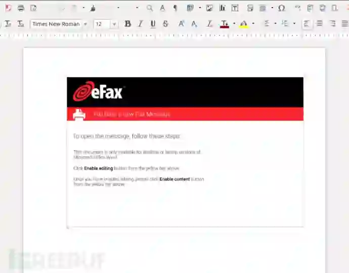 在打开恶意文档之后,我们首先会看到一张图片,告诉我们有一份新的传真电文,并且只有在单击“Enable Editing”和“Enable Content”之后才能查看具体的内容。可恨的是,在点击了所述的按钮之后,我仍然没有能够看到传真电文的实质内容。好吧!反正我也不想看。