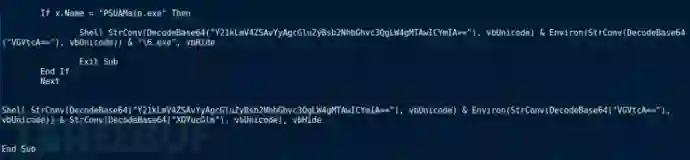 无论原因如何,让我们先回到宏。如果进程名称与PSUAMain.exe匹配 ,则另外2个字符串会被解码并用于形成shell命令,由Shell在行的开头执行。在解码之后,我得到了如下命令: