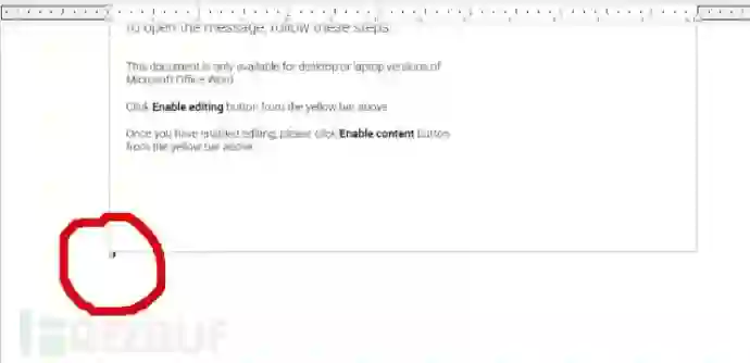 这让我感到很困惑,因为Hancitor的开发者应该不会做一些无用功。于是,我决定对文档和宏进行了更细致的观察。我注意到,在恶意文档中有一个很小的但很显眼的小黄点。