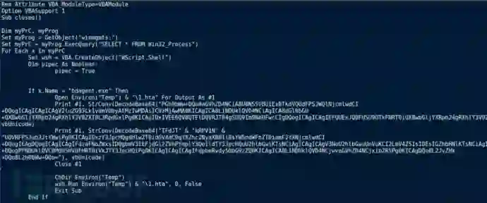 然后,一个for 循环被执行,遍历列表中的每个进程,记为x。对于每个进程,将进程名称与bdagent.exe和PSUAMain.exe进行比较。从名称上看,它们像是由恶意软件下载的恶意文件,以防止出现几个Hancitor实例同时运行的情况。但在我通过Google搜索之后发现,bdagent.exe与BitDefender相关联,而PSUAMain.exe与Panda Security相关联。因此,恶意软件似乎是在检查这两个防病毒程序,并为每个程序运行不同的执行方法。如果bdagent.exe正在运行,恶意宏则将创建%TEMP%\1.hta并将句柄存储在#1中。当你看到Print#1时,宏实际上正在将字符串写入1.hta,而不是将其显示出来。具体来讲,宏会对经编码的字符串进行Base64解码(使用DecodeBase64()),将其转换为unicode字符串,然后写入1.hta。在进行了两次之后,文件会被关闭。最后,使用 一个 WScript.Shell对象将1.hta移动到%TEMP%文件夹并以静默方式执行 ,然后宏退出。