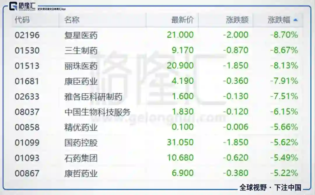 今日,医药板块大幅下挫,复星医药收跌8.7%,报21港元;三生制药收跌8.67%,报9.17港元;丽珠医药收跌8.13%,报20.9港元;康辰药业跌7.91%,报4.19港元。分析指出,系列政策短期对行业的影响具有不确定性,医药行业靠利润大幅增长而股价增长要暂停一段时间,因为创新和仿制药之间的青黄不接。一些机构建议中短期回避化药仿制药。可关注非药领域,如医疗器械、CRO子行业、疫苗产业、医疗服务、药店等。