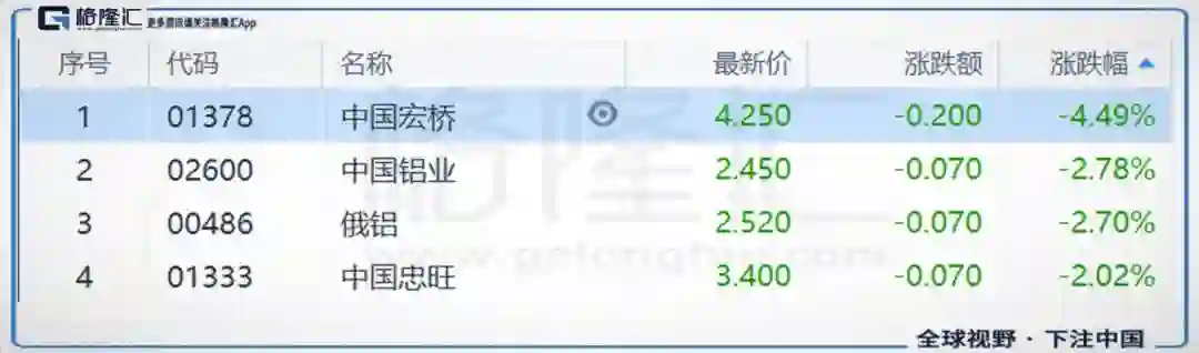 铝板块快速下跌中国宏桥跌3.15%