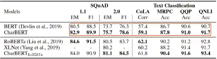 我们在问答、文本分类和序列标注三类任务的8个数据集上进行了验证,发现CharBERT可以在BERT和RoBERTa[3]两个基线上有明显的效果提升;