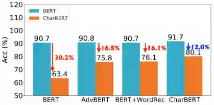 我们可以看到BERT效果下降幅度超过30%,另外两个baseline模型效果降幅明显缩小,而CharBERT下降幅度为12%,显著超过了所有模型。