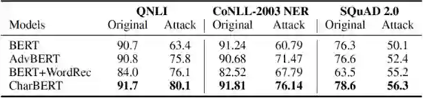 我们通过字符攻击的方式构造了这三类任务对应的噪音测试集合,发现CharBERT可以大幅度提升模型的鲁棒性。