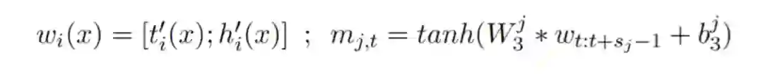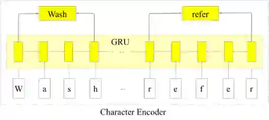 我们将整个输入序列看成字符序列,词之间使用一个空字符隔开。将每个字符映射成一个固定大小的embedding后,使用Bi-GRU构建每一个字符的表示,然后将每个词的首尾字符的表示拼接作为每个词对应的表示,对应公式如下: