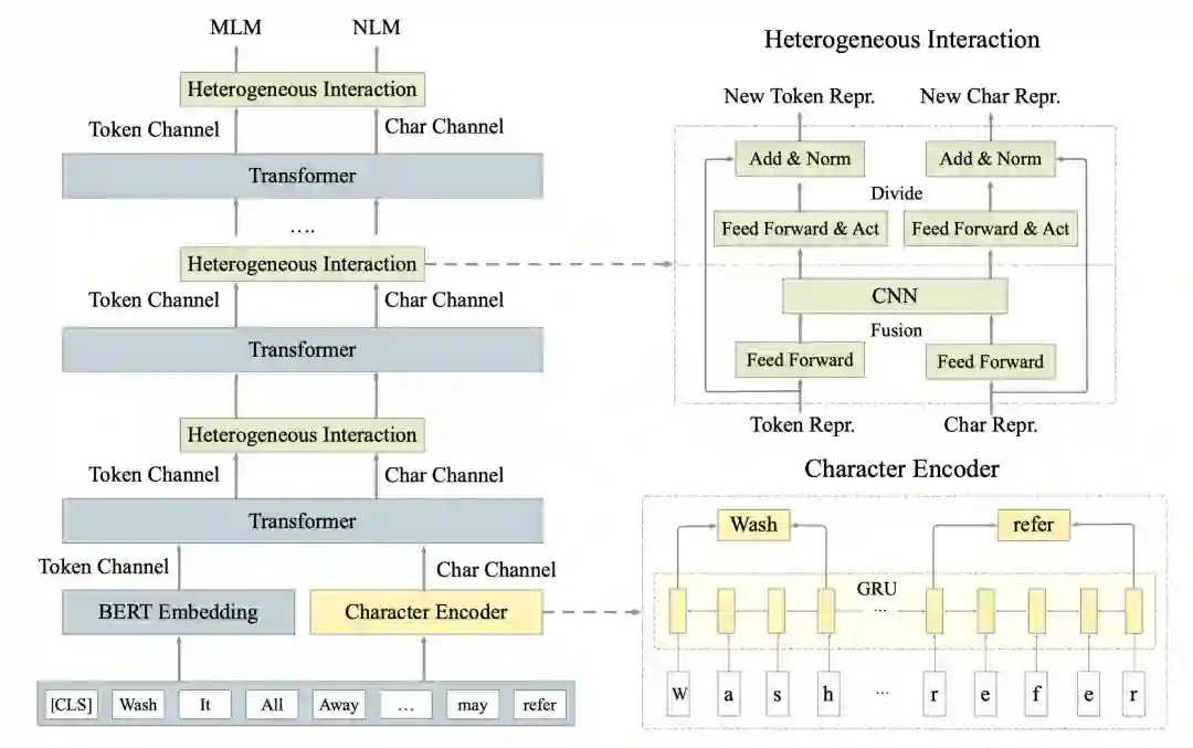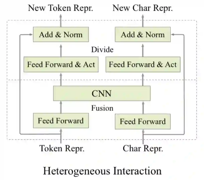 Character Encoder的输入是字符序列,输出与BERT Embedding具有相同shape的字符表示。Heterogeneous Interaction在每个transformer之后进行两个信息流的融合计算,因此其输入和输出具有相同的shape。