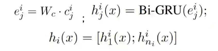 其中ni表示第i个词的长度,h表示通过字符信息构建的词向量。基于Bi-GRU的字符表示,在每个词的首尾字符位置是带上下文信息的,所以将其拼接作为词的表示。