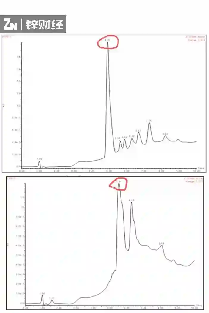 马亮向我们提供了两份完整的样本检测报告,根据两款产品的总离子流图显示,两瓶样本的形状差异较大,且主要成分的流出时间相差0.6分钟即36秒,远超0.1分钟的误差范围。
