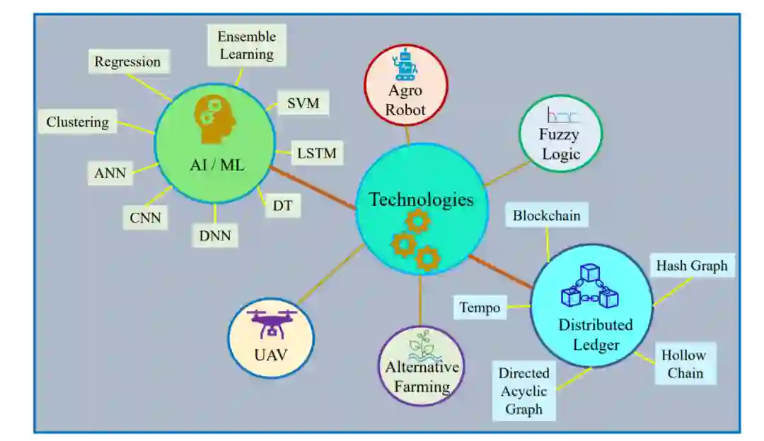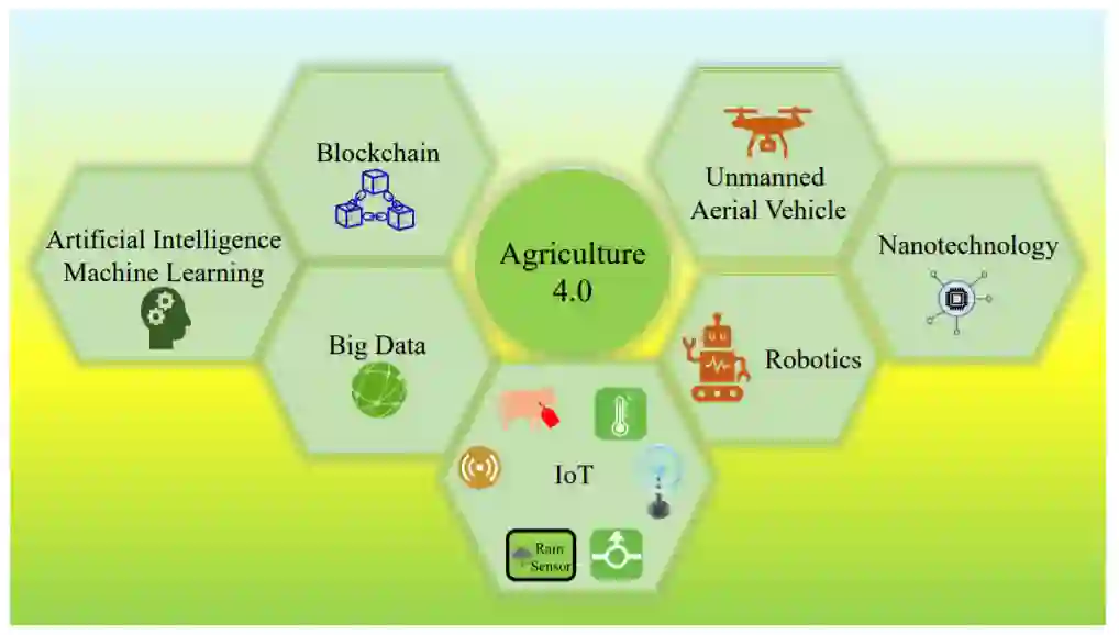 为了缓解这些问题,食品和农业行业欢迎“农业4.0”,这是一场以科技为核心的绿色、智能革命。图1为智慧农业概述。如果我们回顾一下工业革命,我们会发现它实际上开始于新石器时代和铜器时代,当时的人们使用木头和岩石作为工具,后来又使用金属作为农业工具。但是工业1.0是从蒸汽机的使用开始的。大规模生产和使用电能开创了工业2.0。工业3.0伴随着自动化和信息技术的使用,而工业4.0则通过人工智能、大数据(BD)、物联网(IoT)、机器人技术等来连接网络物理系统中的机器和节点。一场平行的农业革命也随之发生——首先是农业1.0的本土工具,农业2.0的拖拉机和化肥的使用,农业3.0的决策和监控系统,以及农业4.0[5]的智慧农业。农业4.0是由多种技术的融合定义的,如物联网、人工智能、区块链、无人机(UAV)的使用、纳米技术和机器人技术,如图2所示