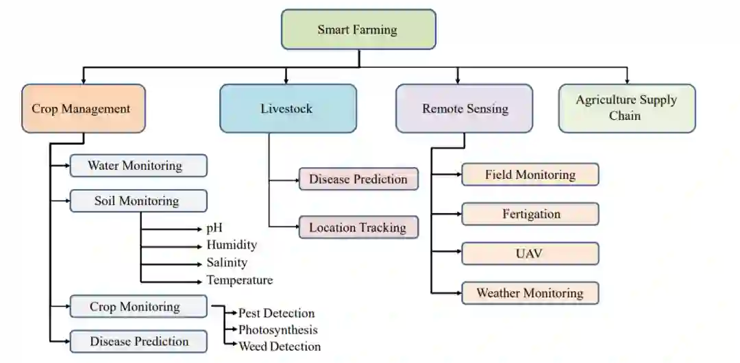 本节将讨论智慧农业的应用领域。图8展示了智慧农业的一些应用领域,如作物管理、智能灌溉、牲畜监测、病虫害防治等。图10展示了智能温室、无人机和自动拖拉机、水耕系统等应用领域。