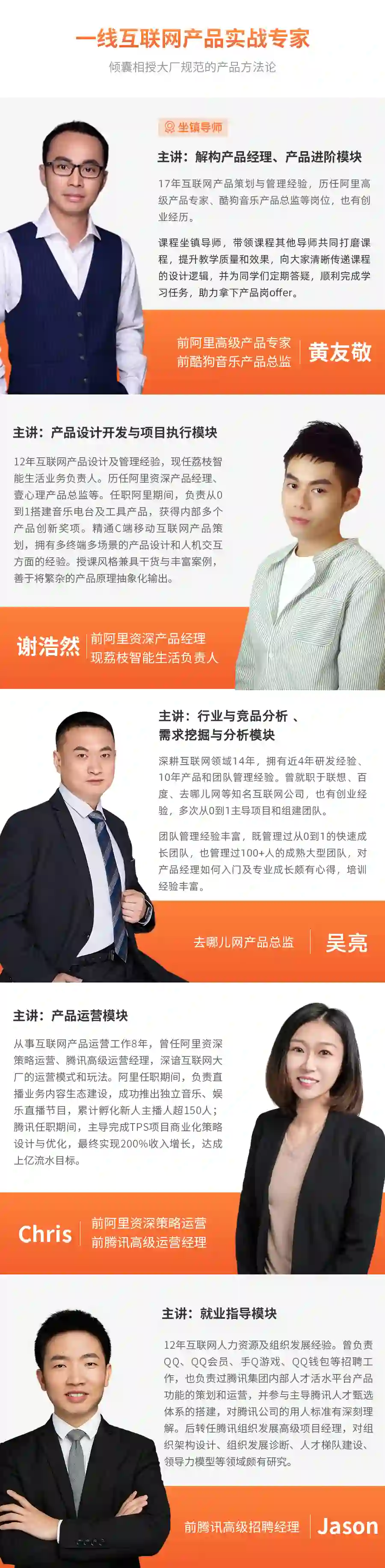 这些老师不仅拥有多年产品实战经验,而且经历过大厂上亿项目,能够毫无保留地把他们多年沉淀下来且依然实用的产品方法论传授给大家。