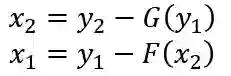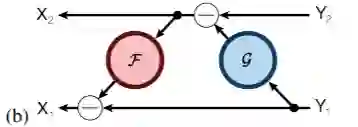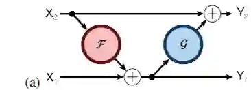 可逆神经网络将每一层分割成两部分,分别为x1和x2,每一个可逆块的输入是(x1,x2),输出是(y1,y2)。其结构如下:
