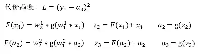 上述结构就是一个两层网络组成的残差块,残差块可以由2、3层甚至更多层组成,但是如果是一层的,就变成线性变换了,没什么意义了。上述图可以写成公式如下: