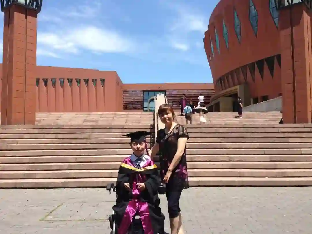 学校的领导和系里的老师在生活、学业等方面都积极给予晓沅支持和帮助。“大一时班主任李洪波老师每次考试前都会打电话过来鼓励晓沅,怕他跟不上学习的节奏,会给他树立信心。平时上课的时候,去四教、五教,没有电梯,同学们都会主动帮助我们。我特别记得有一年冬天,下了很大的雪,我送晓沅去教室的路上,积雪很深很滑,电动轮椅在雪坡上不去,他的同学们看到了就直接把晓沅抱到了教室,那是一段很远很远的上坡路,当时非常感动……”