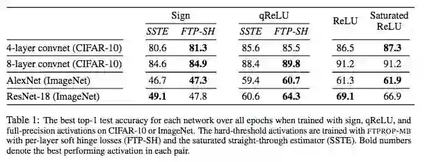 在这项工作中,我们提出了一种新型混合凸组合优化框架,用于学习具有hard-threshold单元的深层神经网络。组合优化用于为hard-threshold隐藏单元设置离散目标,使得每个单元仅有一个线性可分离的问题要解决。然后,网络分解成单个感知器,给定这些目标,可以用标准的凸方法学习。基于此,我们开发了一种用于学习深度hard-threshold网络的递归算法,我们称之为可行目标传播( feasible target propagation ,FTPROP),以及一个高效的mini-batch版本(FTPROP-MB)。我们证明了常用但不太合理的straight-through estimator(STE)是FTPROP-MB的特殊情况,这是由于在每个层使用饱和hinge loss和我们的目标启发式(target heuristic)引起的。最后,我们定义了soft hinge loss,并表明与STE相比,在每一层具有soft hinge loss的FTPROP-MB提高了CIFAR-10和ImageNet的多个模型的分类精度。