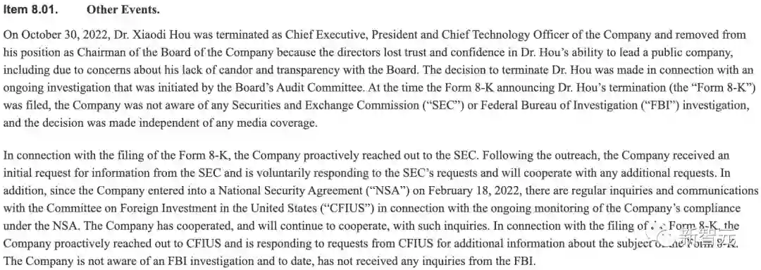 文件声称,公司在侯晓迪被解雇时并不知道有来自SEC或FBI的调查,且董事会的这一决定与媒体报道无关。