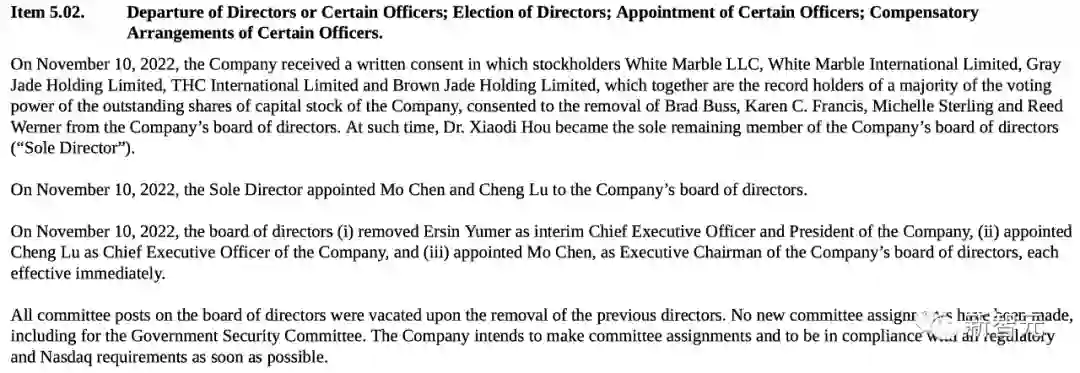 这一切都在这份文件中得到了印证:在2022年11月10日,董事会解除了Ersin Yumer作为公司临时首席执行官和总裁的职务,任命吕程为公司首席执行官,并任命陈默为公司董事会执行主席,均立即生效。