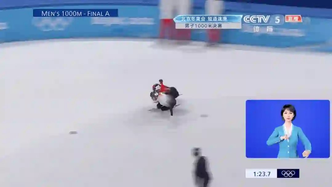 「聆语」解说短道速滑男子 1000 米决赛,任子威夺金。