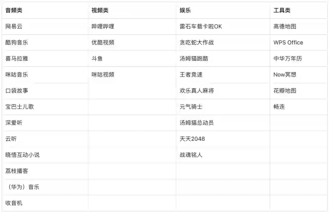 这绝对是整车最核心的亮点,也是问界 M5 这款产品宣发口的重中之重。流畅,逻辑清晰,语音助手识别能力出色是整套车机的核心亮点,这就是一块能够显示车辆信息的华为平板,但以上两点绝非我对一台车机的所有期望。当前鸿蒙 2.0 的版本对于三方应用的支持和适配仍然不多,应用市场目前支持的所有应用清单如下⬇️,整车版本 V1.0.103SP10,鸿蒙 2.0.1