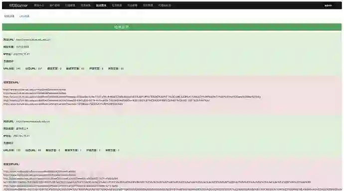 网站爬虫主要是周期性对目标整站页面进行爬取,爬虫算法主要采用了宽度优先遍历策略,可进行网页链接搜集、动态 URL 搜集、网站敏感字检索、暗链检索、坏链检测、存储网页快照等。