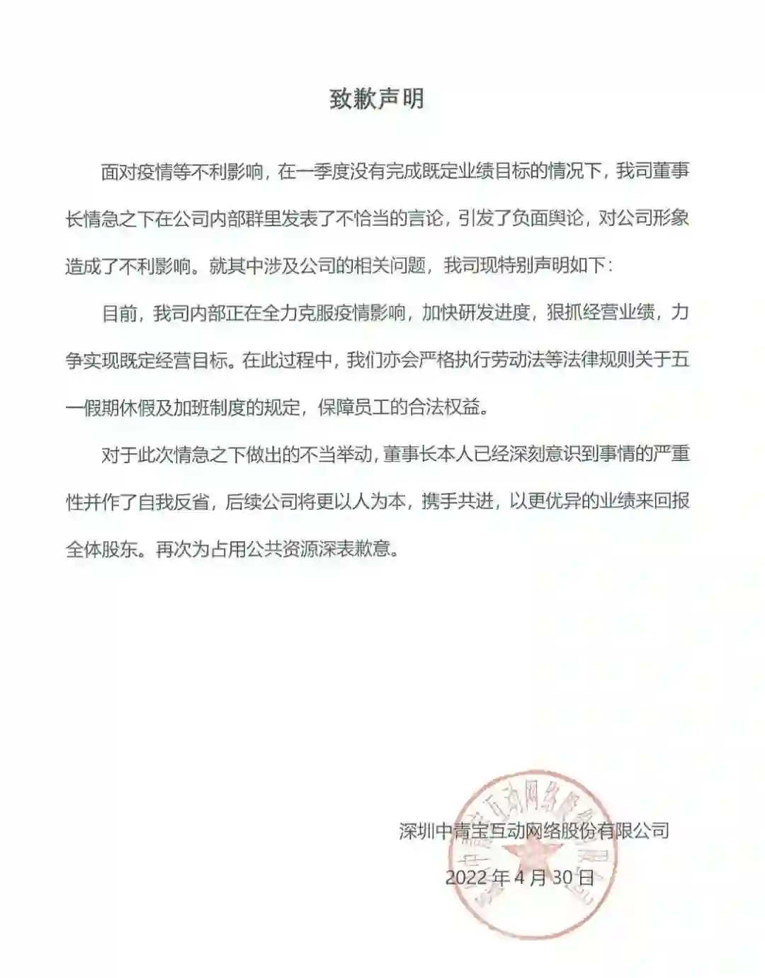中青宝发布声明,就公司高管内部群发表不当言论致歉。声明中称,在一季度没有完成既定业绩目标的情况下,董事长情急之下在公司内部群里发表了不恰当的言论。董事长本人已经深刻意识到事情的严重性并做了自我反省。此前,网友曝光的若干张聊天记录中显示,中青宝董事长强制员工五一加班,并称“不服的,马上炒掉”。