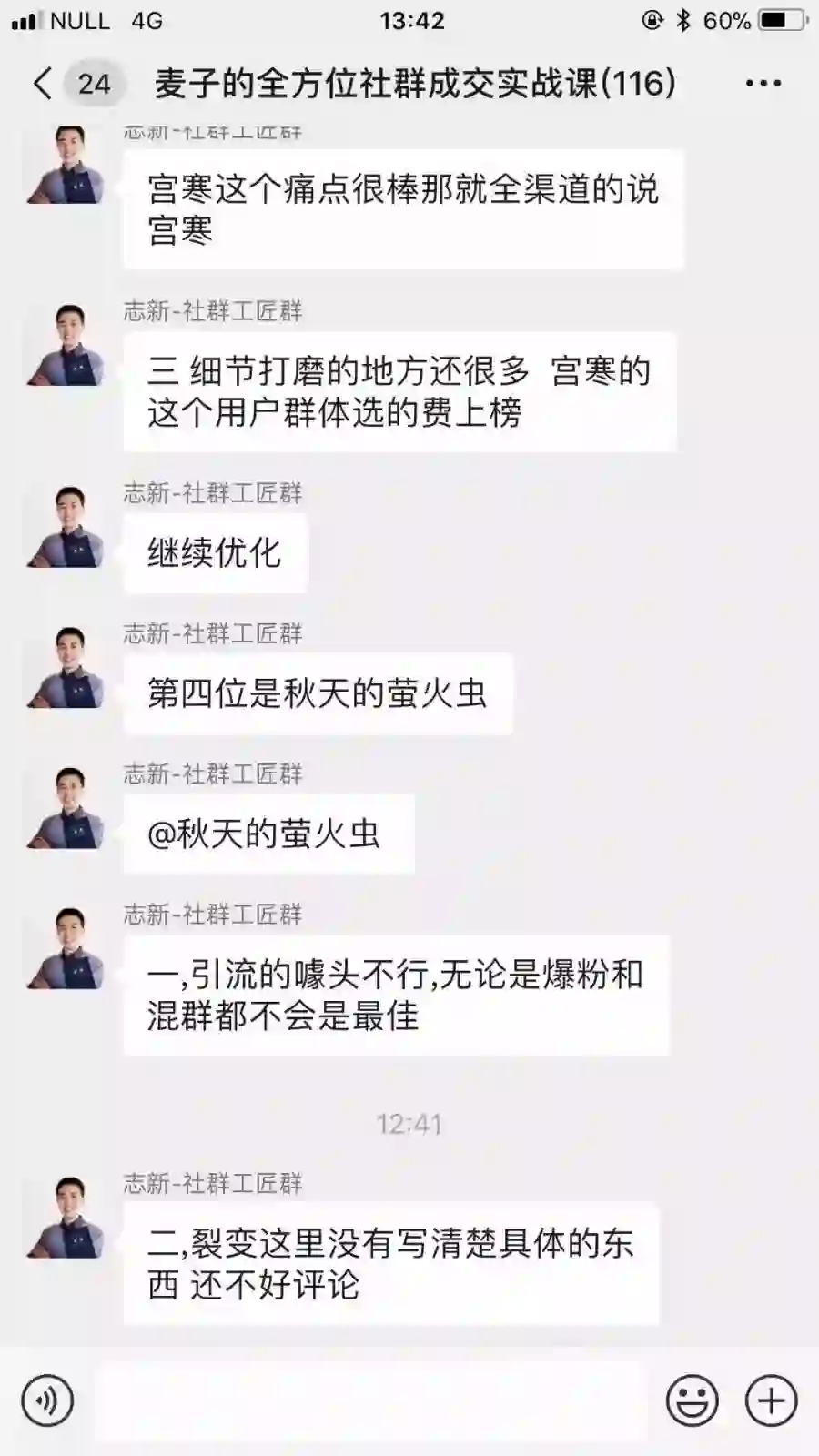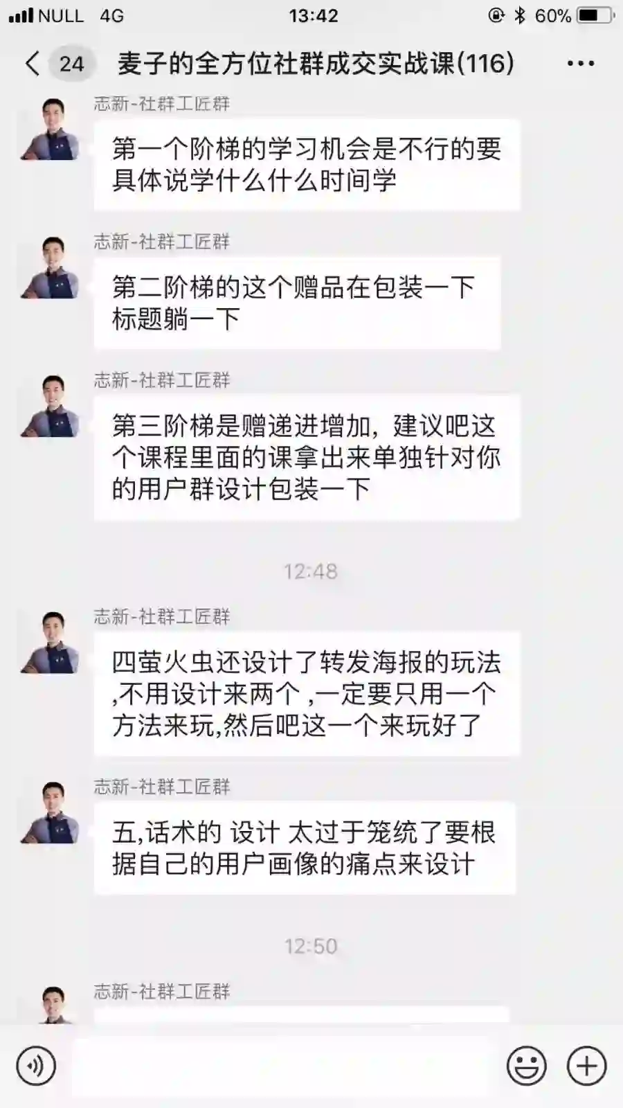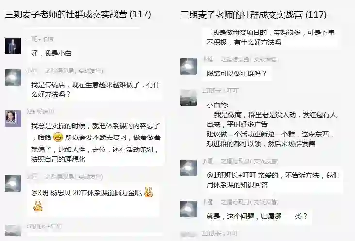 就这样,短短的15天,实战内容已经涵盖了用户画像分析、人群定位、噱头设计、裂变策划、群运营管理、促销策划、活动引爆、引流与裂变设计、群发售设计、朋友圈发售计划、返场补销等一系列社群必备大环节!