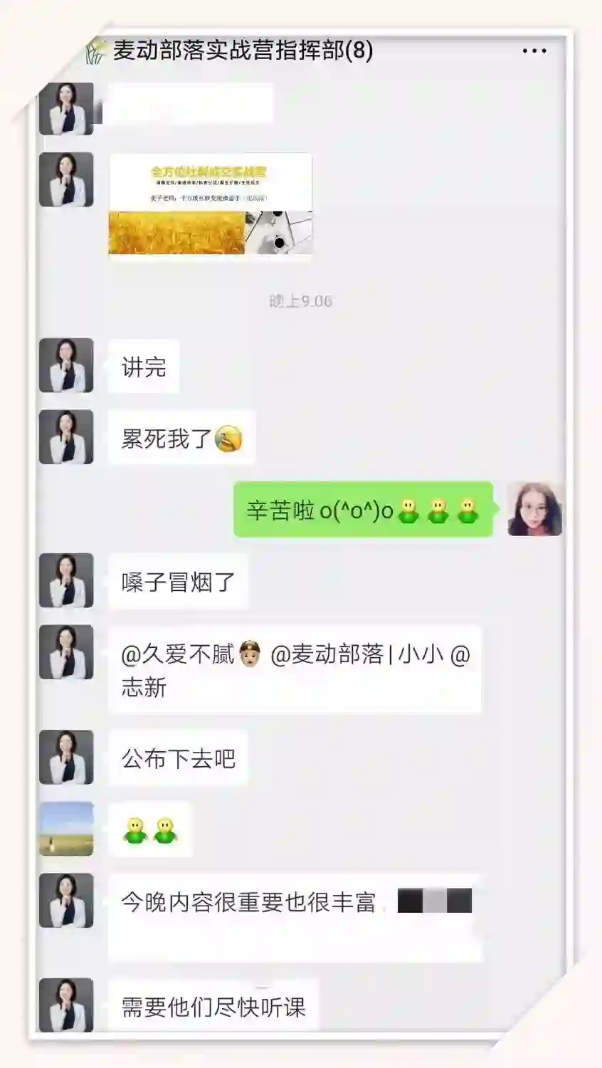 麦子这次的实战营更是如此;麦子和辅导员全程手把手辅导、教练式陪同,整整二十三四天的时间!她本人比学员更上心,更在意大家的收获与最终的成功。
