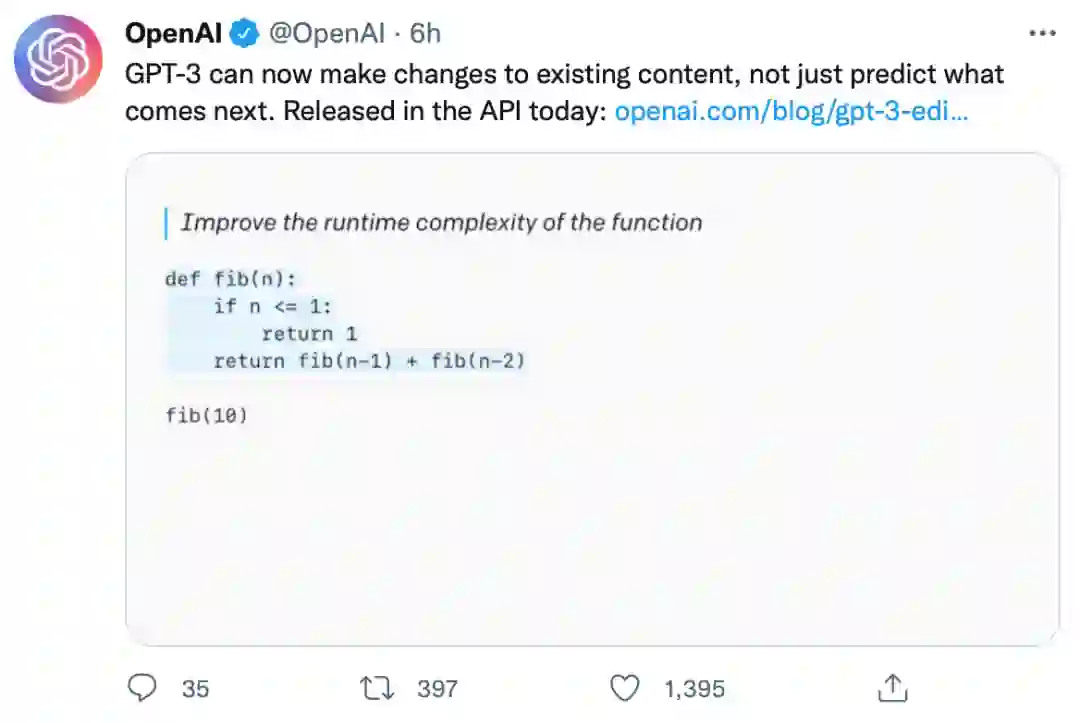 需要注意的是,此处的「编辑」更多是「修改」现有文本,而不是像旧的 GPT-3 一样,沿着已有文本完成后面的写作。