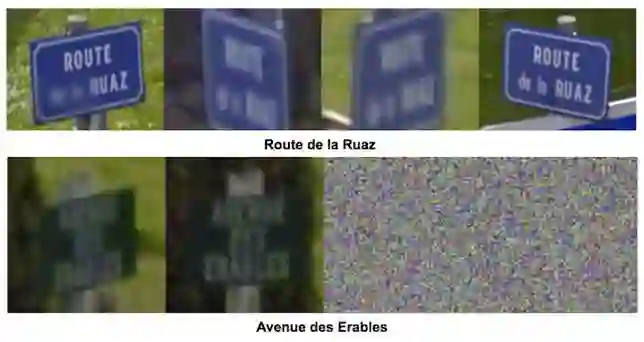 图中为法国街道名称标识数据集中的一个例子,被谷歌的系统正确识别。上图为同一标识的四种不同视角