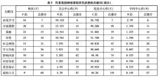 为更加明了地判定各关键词节点中心性、接近中心性、中间中心性数值的变化,本研究对各关键词的节点中心性(D)、接近中心性(C)、中间中心性(B)进行数值降序排列,然后按照“B总排序值<D总排序值&B总排序值<C总排序值”的条件筛选符合要求的关键词。通过数据比价分析,本研究发现节点中心性和接近中心性两项指标较低,而中间中心性较高的关键词累计62个(表5),其中词频在[3,11]范围内的关键词为56个,占90.32%,这也验证了通过降低高频关键词阈值深度了解我国网络课程研究趋势的必要性。