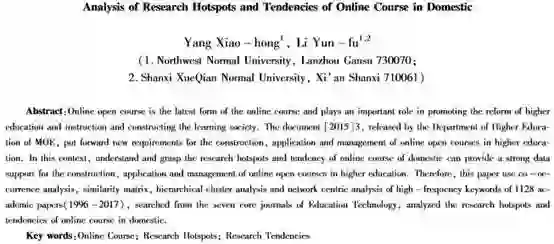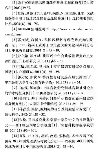 自“慕课元年”至今,我国对以MOOC为代表的在线开放课程的研究与实践已实施五年有余,教高〔2015〕3号文件和教高厅函〔2017〕40号文件的发布将我国在线开放课程的研究与实践推向了新的高度。在国内在线开放课程研究与实践的初期阶段,通过以教育技术学专业七种核心期刊为数据源,分别采用高频关键词共现分析技术、社会网络中心性分析技术对我国网络课程的研究热点与研究趋势进行了宏观分析和归纳总结,为当下在线开放课程研究与实践的深入推进提供了参考性框架。然而,在学习科学、网络学习心理学等相关领域研究的推动下,在线开放课程研究所具有的跨学科特性越来越明显,仅根据高频关键词共词矩阵进行分析,难以区分跨领域研究与重复研究,因此需要研究者借鉴更多的先进方法进行后续深入研究,以更为精准地分析我国网络课程的研究热点与趋势。