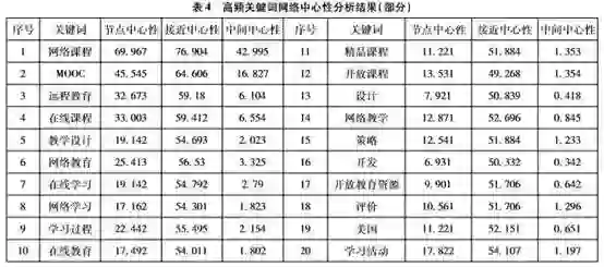 为更加准确、科学地从高频关键词中分析出我国网络课程的研究趋势,通过对多种方法进行比较分析后,最终选择了网络中心性分析技术。中心性的节点中心性、中间中心性、接近中心性能很好地反映社会网络中的结点和网络的整体特征,不但可以发现某一领域的研究热点,还可以识别未来的发展趋势。在某个研究领域中,节点中心性较高的度通常代表着当前的研究热点,节点中心性和接近中心性两项指标较低,而中间中心性较高的节点代表着新的发展趋势[13]。因此,本研究先通过BICOMB2软件将阈值在[3,384]范围内的关键词生成共现矩阵,然后将该矩阵导入Ucinet6软件进行网络中心性分析,分析结果如表4所示。