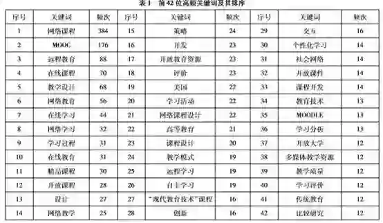 然而,将研究样本关键词按照频次由高到低排序后,第37—42个关键词的频次均为12,第40、41、42个关键词分别为“学习评价”“传统教育”“比较研究”,且与本研究主题密切相关。鉴于此,为增强研究的有效性,在g指数算法的基础上,根据研究需要将前42个关键词确定为高频关键词,如表1所示。最终确定的高频关键词词频累计为1562,占总词频的31.42%;包含高频关键词的文献共计915篇,占样本总量的81.12%。这意味着通过对前42位高频关键词的相关分析能够在很大程度上反映我国网络课程的研究热点。