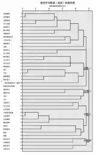 对高频关键词的聚类分析能够进一步反映高频关键词之间的亲疏关系,有利于深入分析我国网络课程的研究热点。关键词聚类分析的原理是以“共词”为分析对象,利用聚类的统计学方法,把关联密切的关键词聚集在一起形成类团。关键词聚类分析时,先以最有影响的关键词生成聚类,再以聚类中的种子关键词及相邻的关键词再组成一个新的聚类。关键词越相似它们的距离越近,反之,则较远[7]。