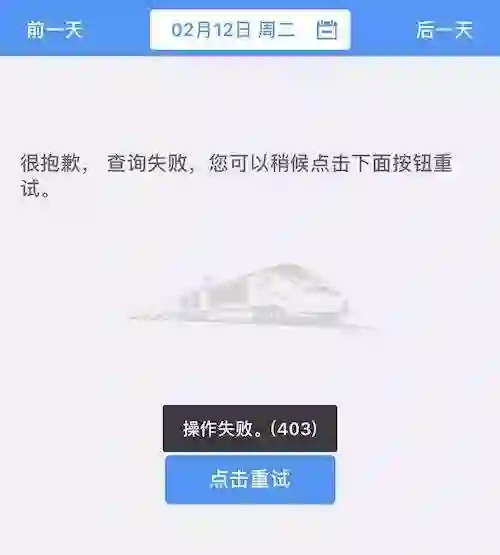 12306在使用时数次显示“操作失败”,无法显示列车列表;飞猪检索时未出错,预约购票后在第二天早上完成出票。