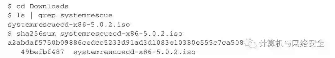 一旦找到映像已发布的哈希值,将计算下载的文件的哈希值并比较这两个值。该示例生成在同一个目录中下载的SystemRescueCd映像的SHA256哈希值:
