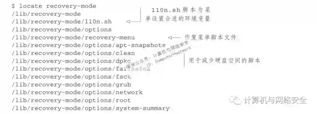 如果在/lib/recovery-mode/目录下寻找,将看到recovery-menu文件是显示如图3所示的菜单界面的脚本。option/目录包含执行每个菜单项的文件。例如,如果可能的话,fsck将会检查并修复任何损坏的系统文件。