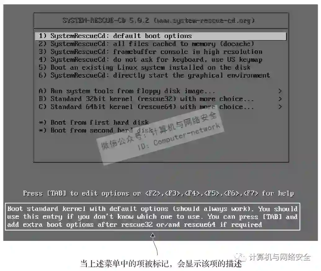 图13 SystemRescue启动时显示的Boot Options菜单。注意页面底部每个选项的详细解释