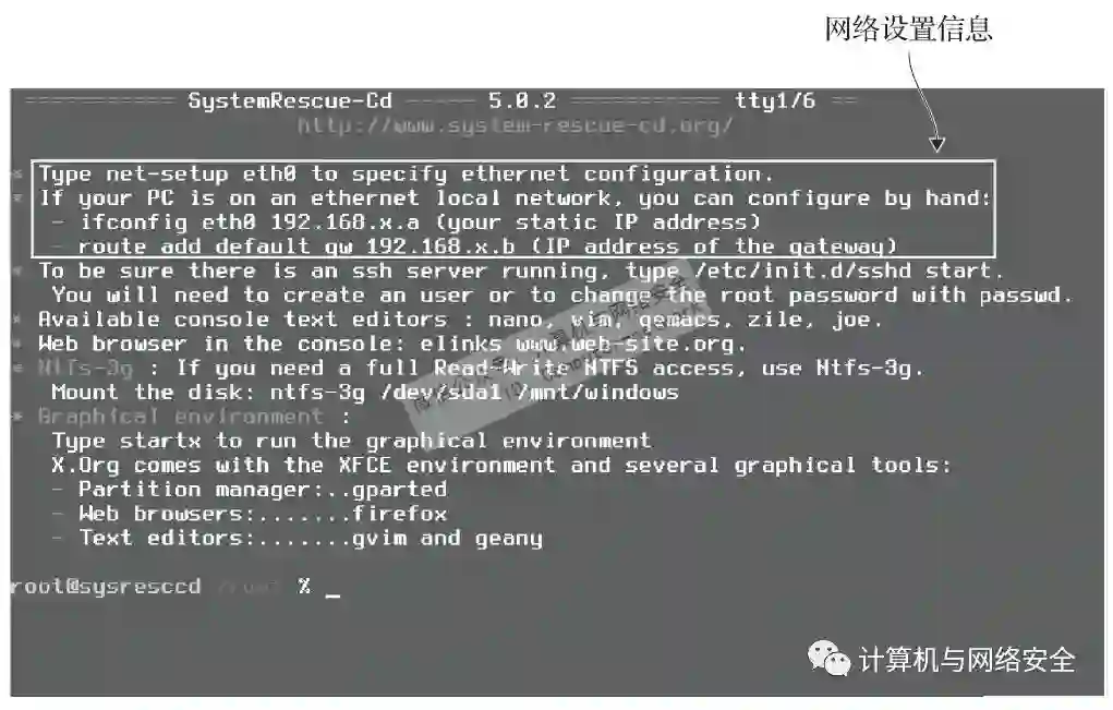 图14 SystemRescue shell。注意默认情况下可用文本编辑器(包括Nano)或键入startx启动图形桌面