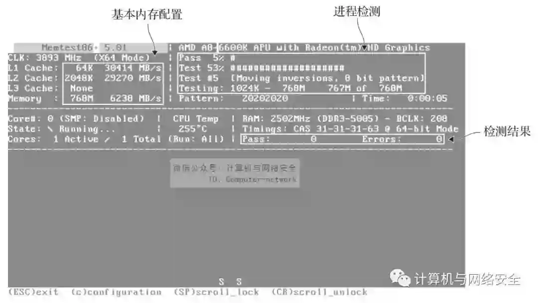 选择Test Memony(使用上下箭头键并按Enter)将进入Memtest86+程序(图11)。该程序对RAM进行多次扫描,显示扫描过程中发现的任何错误。如果全程至少运行几次后没有返回错误,那么内存可能不是引发问题的罪魁祸首。这可能是好消息,也可能是坏消息,毕竟,仍然不知道是什么导致了系统崩溃。