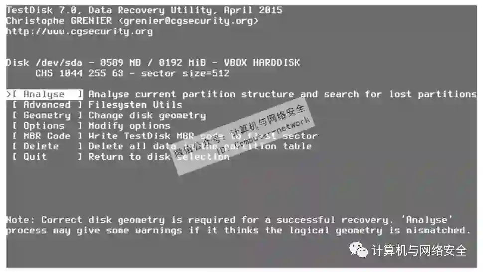 然后会发现自己面对一个如图15中显示的屏幕,可以要求TestDisk分析磁盘,寻找现有的分区。当发现并适当地标记了损坏的分区时,可以将更改写入磁盘,并且应该能够再次成功启动。