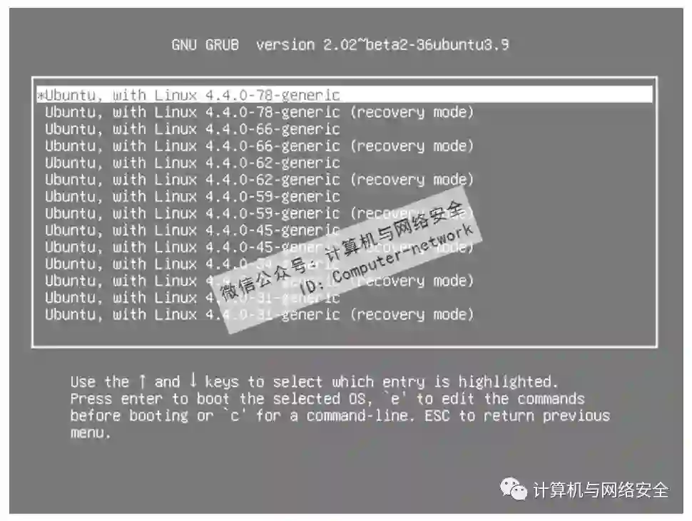 图2 Ubuntu下安装GRUB Advanced Options菜单显示最新的和旧的内核版本链接,以及在恢复模式下的启动选项
