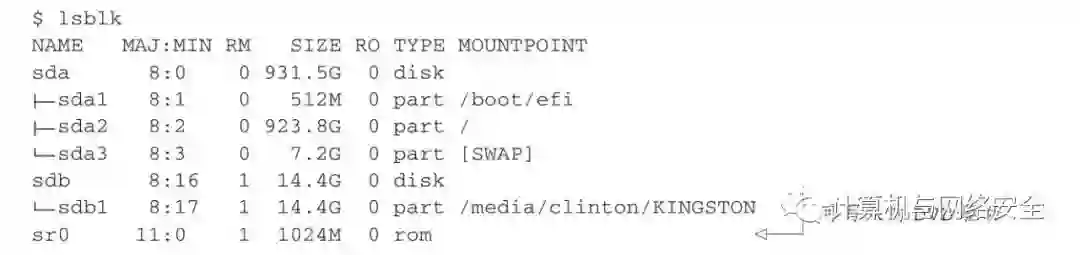 如果打算将映像写入光驱,比如CD或DVD,那么可以通过lsblk获得它的名称,lsblk表示list block devices。驱动器本身必须是可写的。这里DVD驱动器叫作sr0: