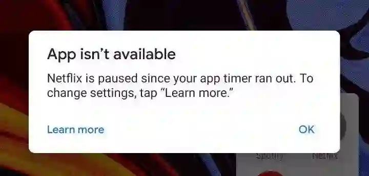 接下来,在达到 App timer 时长限制的同时,Digital Wellbeing 就会通过弹窗告诉你这款应用已经被系统强行「暂停」了(paused)。