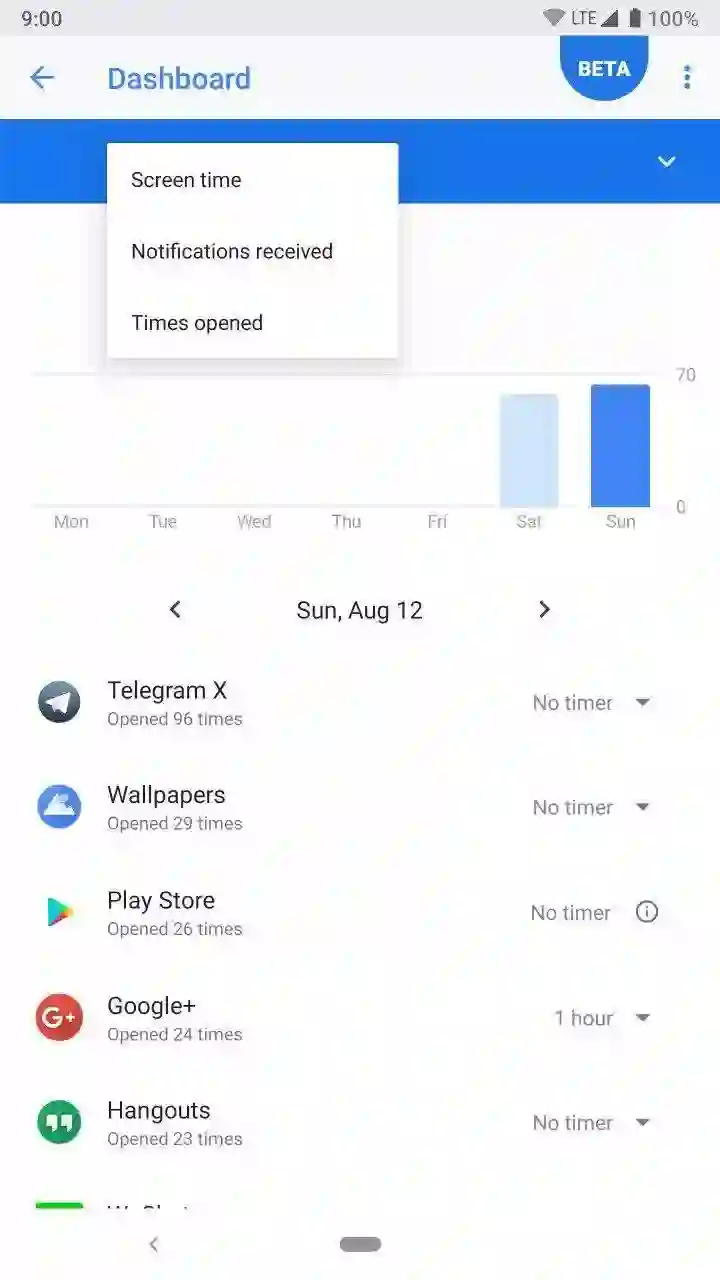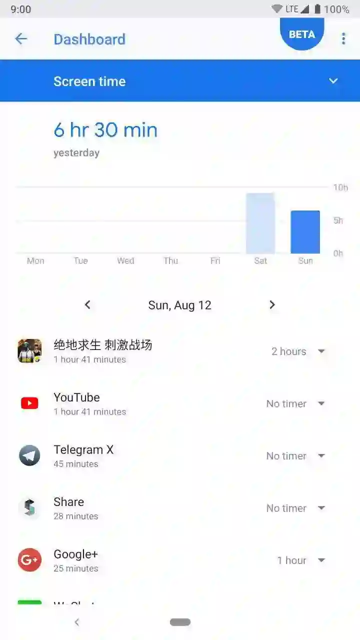 在 I/O 2018 Keynote 的演示中,Dashboard 的样式其实就是上文提到的主界面彩色圆环。但在这次放出的 Beta 版本中,Dashboard 作为 Digital Wellbeing 下的一个子功能,在将彩色圆环样式让位给主界面概览后,采用了顶部蓝色柱状图加底部列表的形式来展示具体的使用数据。