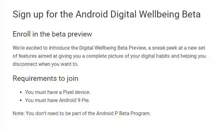 此前,如果你的 Pixel 手机已经升级至 Android 9.0 Pie 正式版,可前往 Beta 测试页面,测试链接会在一个工作日内发送至你填写的邮箱。点击即可加入测试并跳转至 Play 应用商店,通过 Play 应用商店升级相关系统组件后,Digital Wellbeing 选项就出现在了系统设置中。